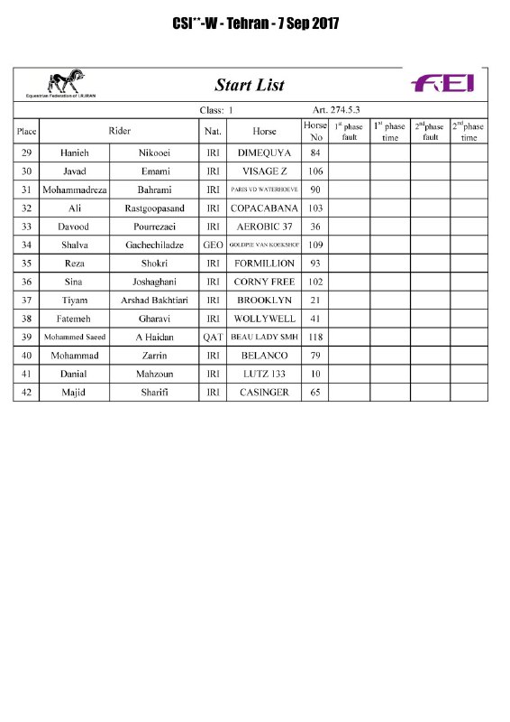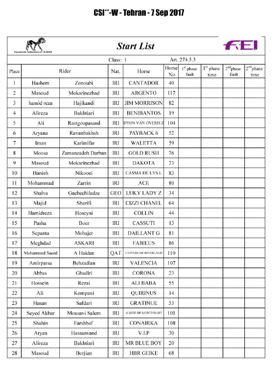 لیست ورود رده 1 روز اول مسابقات CSI2*-W