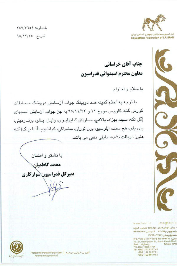 نتایج آزمایشات مثبت دوپنیگ هفته بیست و سوم اسبدوانی گنبدکاووس به شرح زیر است.