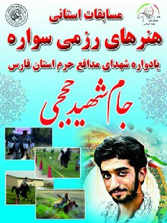 مسابقات هنرهاي رزمي سواره استان فارس (جام شهداي مدافع حرم استان فارس وشهيد سرجدا محسن حججي )همزمان باهفته ولايت وامامت فردا يكشنبه ١٢شهريور از ساعت ١٦ درباشگاه ملل زرقان برگزار مي شود.