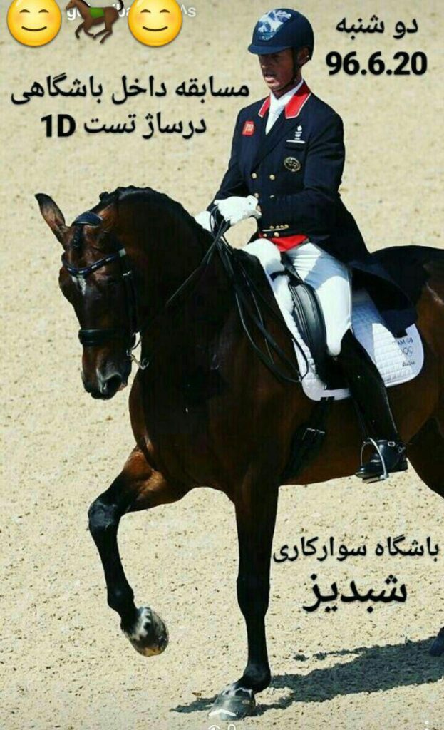 اولین دوره مسابقه درساژ تست 1Dدر ساعت ۱۸ روز دوشنبه مورخ ۲۰ شهریور در باشگاه سوارکاری شبدیز سمنان برگزار می شود