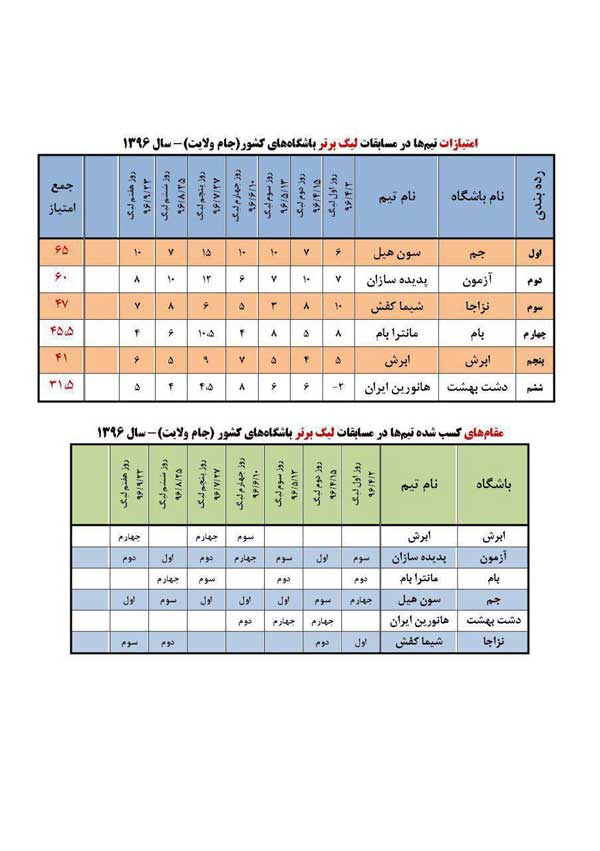 امتیازات تیم ها در مسابقات لیگ برتر باشگاه های کشور(جام ولایت)