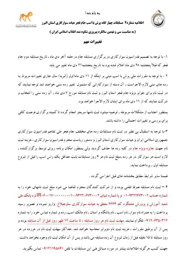 اطلاعیه شماره چهار مسابقات چهارگانه پرش با اسب جام فجر استان البرز