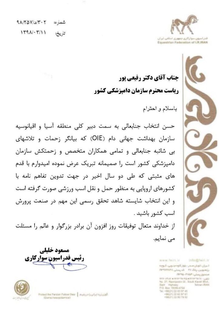 پیام تبریک رییس فدراسیون سوارکاری به جناب اقای دکتر رفیع پور رییس محترم سازمان دامپزشکی کشور