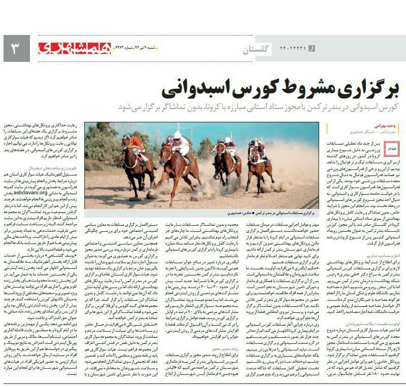 کورس اسبدوانی در بندرترکمن با مجوز ستاد استانی مبارزه با کرونا، بدون تماشاگر برگزار خواهد شد. گلستان_ورزشی وحید بهرامی