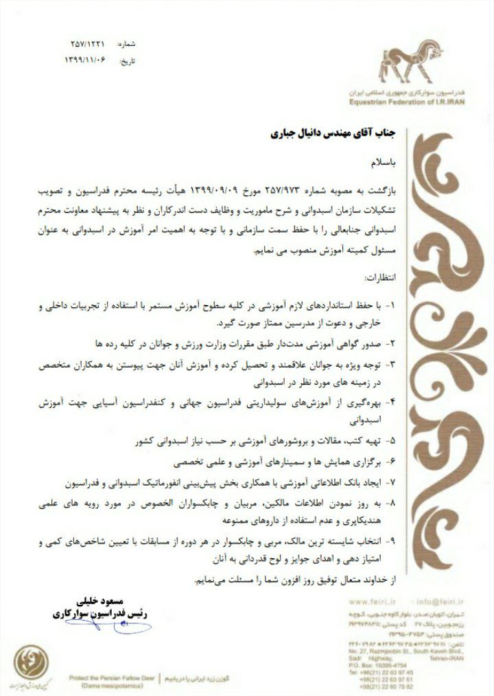 ️طی حکمی از سوی مسعود خلیلی رییس فدراسیون سوارکاری،مهندس دانیال جباری به سمت مسئول کمیته آموزش اسبدوانی منصوب شد.