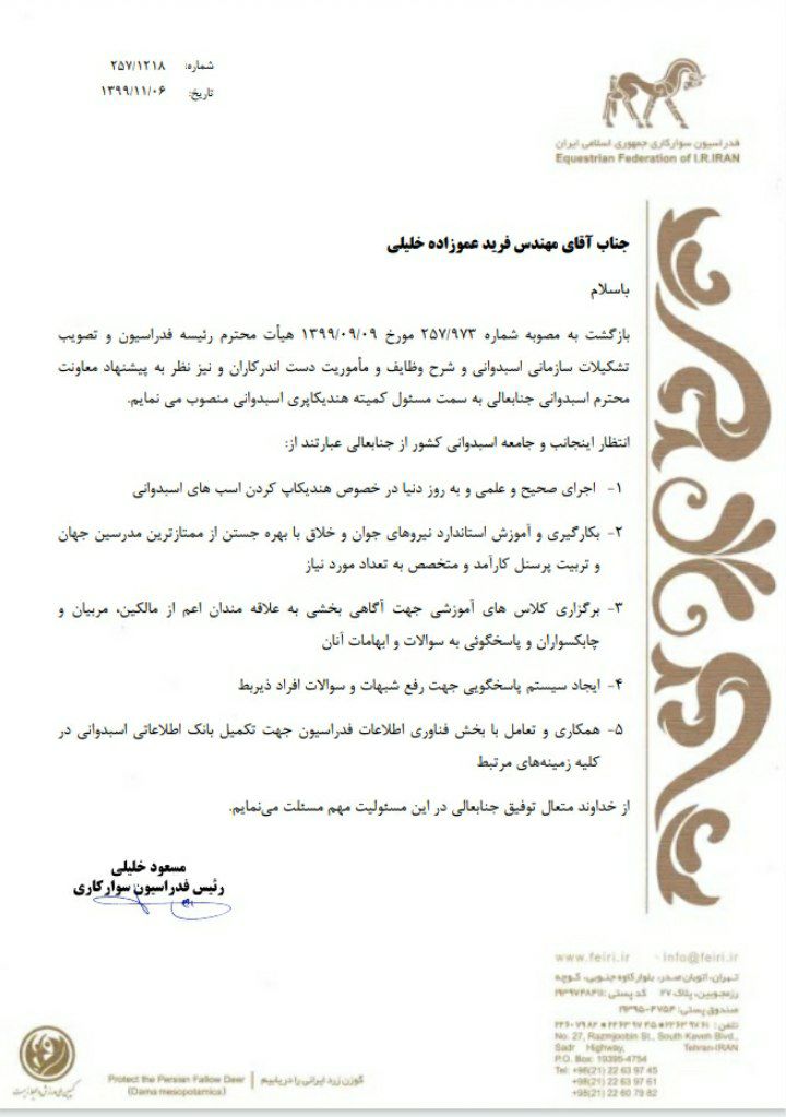 طی حکمی از سوی مسعود خلیلی رییس فدراسیون سوارکاری،مهندس فرید عموزاده خلیلی به سمت مسئول کمیته هندیکاپری اسبدوانی منصوب شد.