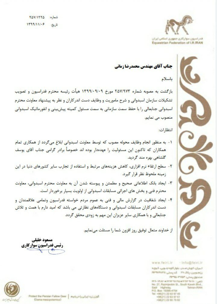 طی حکمی از سوی مسعود خلیلی رییس فدراسیون سوارکاری،مهندس محمدرضا زمانی به سمت مسئول کمیته پیش بینی و انفورماتیک اسبدوانی منصوب شد.