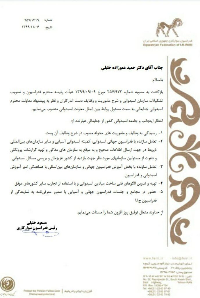 ️طی حکمی از سوی مسعود خلیلی رییس فدراسیون سوارکاری،دکتر حمید عموزاده خلیلی به سمت مسئول روابط بین الملل معاونت اسبدوانی منصوب شد.