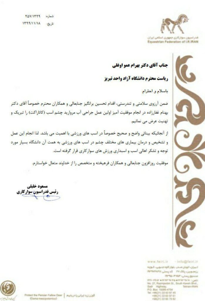 ️پیام تبریک رئیس فدراسیون سوارکاری ج.ا.ا به دکتر بهرام عمواوغلی برای انجام اولین عمل موفقیت آمیز جراحی آب مروارید چشم اسب