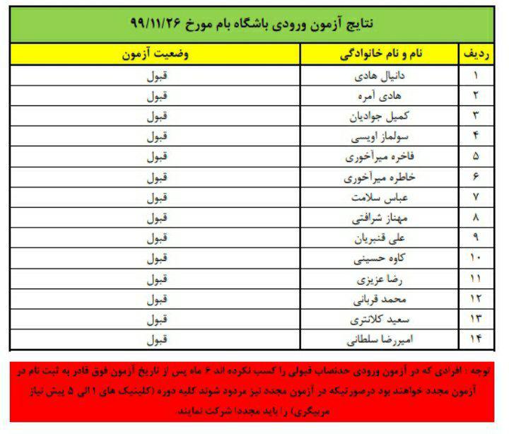 نتایج آزمون ورودی باشگاه بام ۲۶ بهمن ۹۹