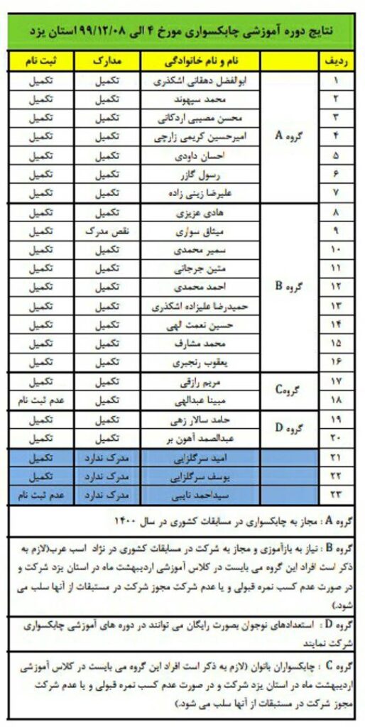 نتایج دوره آموزشی چابکسواری مورخ ۴ الی ۸ اسفند ۹۹ استان یزد