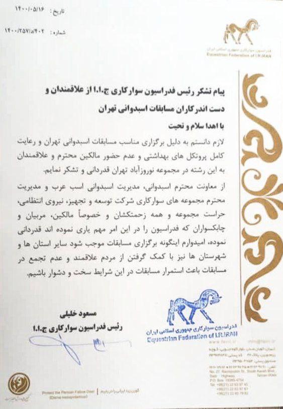 پیام تشکر رئیس فدراسیون از علاقمندان و دست اندر کاران مسابقات اسبدوانی تهران