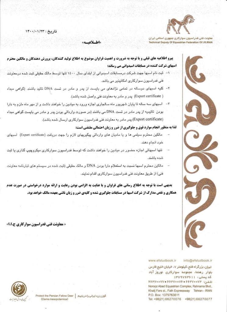 🔴پیرو اطلاعیه های قبلی در خصوص صدور فرم کشش جهت سیلمی های ثبت شده در معاونت فنی فدراسیون سوارکاری و با توجه به مفاد تعهدات دریافت فرم کشش و از آنجا که به منظور ثبت و صدور مدارک هویتی نتاج حاصل، دارا بودن تست DNA پدر و مادر الزامی است، از مالکین محترم سیلمی ها […]