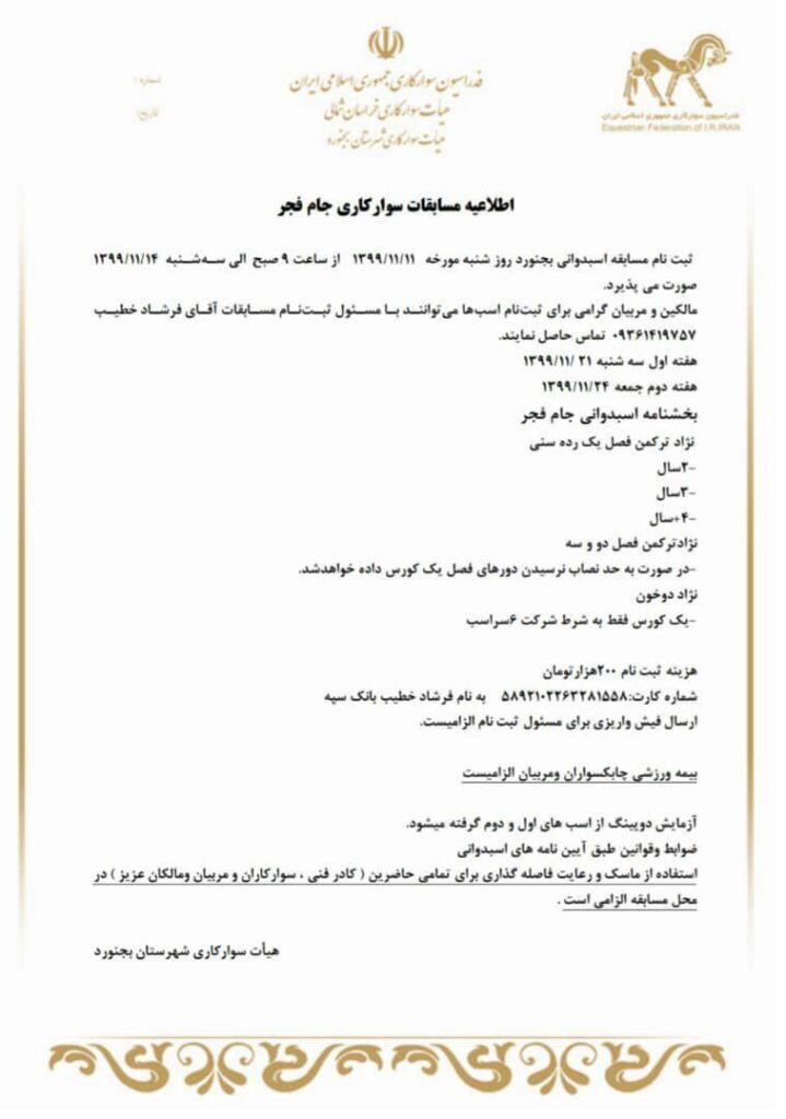 هیئت سوارکاری استان خوزستان برگزار میکند 🏇🏿اولین دوره مسابقات استانی هنرهای رزمی سواره 🏹 (جام آینده سازان) زمان برگزاری پنجشنبه ۹ بهمن سال ۱۳۹۹ 🕐ساعت ۱۳ محل برگزاری : شوشتر باشگاه سوارکاری دیمچه و با حضور استاد علی قورچیان ریاست محترم کمیته هنرهای رزمی سواره فدراسیون ج.ا.ا هیئت سوارکاری خوزستان🇮🇷 کمیته هنرهای رزمی سواره