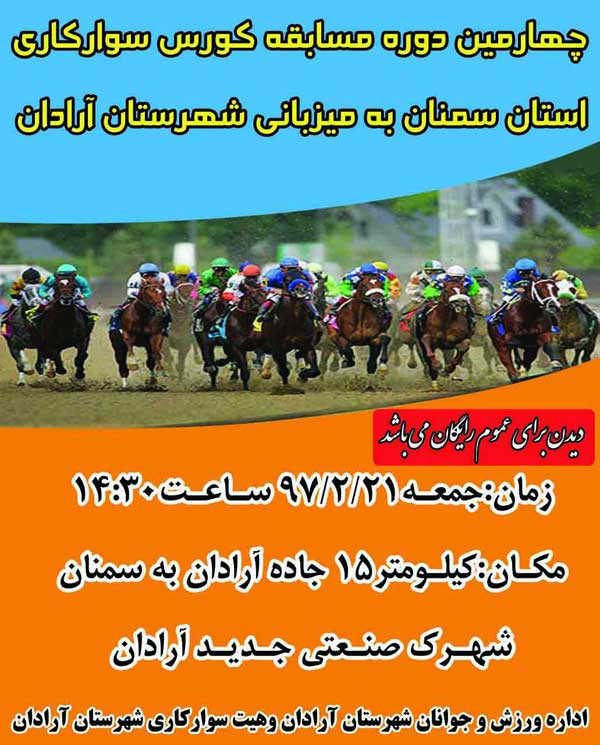 بمناسبت گراميداشت روز ارتش زمان: جمعه ٧ ارديبهشت ماه مکان: باشگاه سواركاري ذوالجناح(نزاجا) این رویداد در ٣ مسافت ۲۰، ۴۰ و٦٠ کیلومتر برگزار خواهد شد. بازدید مسیر: ساعت ١٣:٠٠ روز پنجشنبه ٩٧/٢/٦ بازرسی دامپزشکی قبل از مسابقه : ساعت ١٥روز پنجشنبه ٦ ارديبهشت انجام میشود. جلسه توجیهی سوارکاران، پنجشنبه در محل مسابقه بر گزار مي […]
