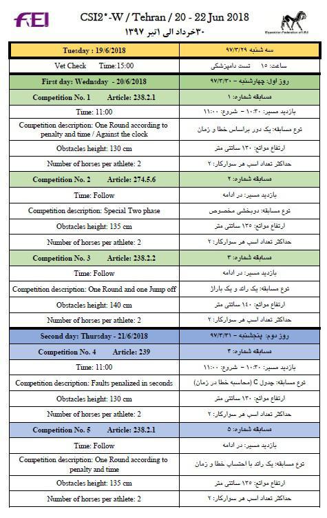 به گزارش روابط عمومی فدراسیون،این مسابقات از تاریخ 30 خرداد الی یکم تیرماه سال 1397 به میزبانی باشگاه سوارکاری نوروزآباد برگزار میشود. مبلغ ثبت نام برای هر اسب :400 یورو +پاسپورت FEI اسب مهلت ثبت نام:چهارشنبه 23 خرداد 1397