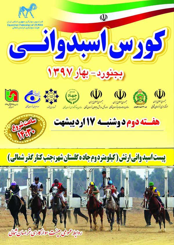 هفته دوم اسبدوانی بهاره بجنورد دوشنبه ۱۷ اردیبهشت ساعت ۱۴:۳۰ پیست اسبدوانی ارتش روابط عمومی هیئت سوارکاری خراسان شمالی