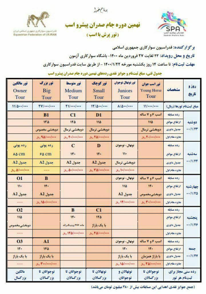 ️اطلاعیه جام صدران پیشرو اسب با توجه به برنامه درسی سوارکاران، مقرر شد مسابقات تور نونهال- نوجوان (Juniors Tour) در روزهای سه شنبه و چهارشنبه آخرین رده به شرح زیر برگزار گردد. سه شنبه: رده D- رده C- تور نوجوان چهارشنبه: رده B- رده O1- تور نوجوان جمعه: تور نوجوان- ردهA1- رده O3