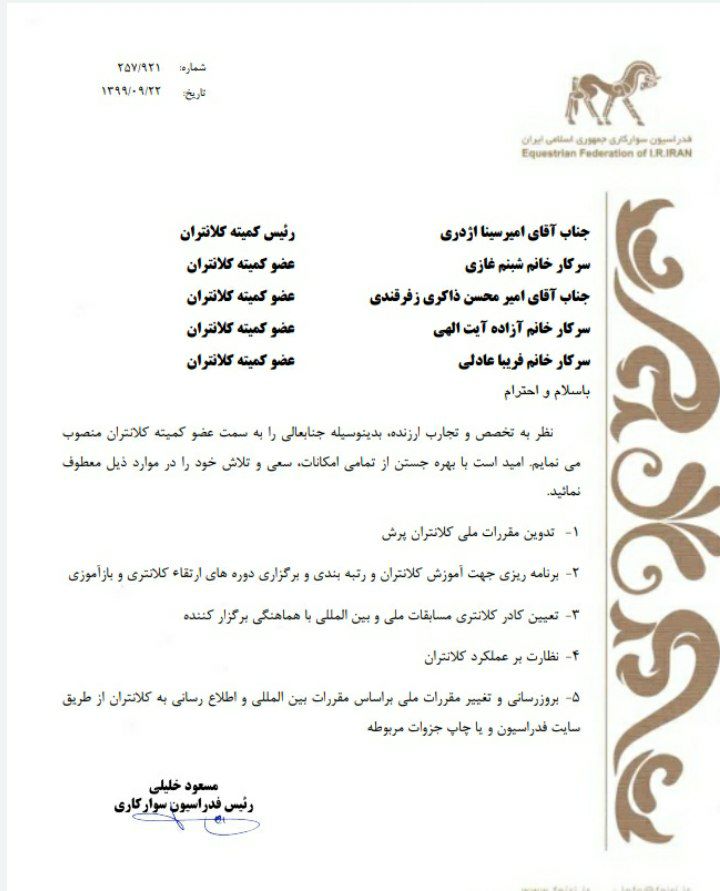 ⭕️طی حکمی از سوی مسعود خلیلی رییس فدراسیون سوارکاری، رییس و اعضا کمیته کلانتران منصوب شدند.