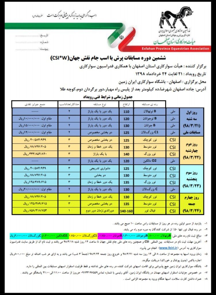 اطلاعيه شماره 5 در مورد مسابقات بین المللی جام نقش جهان (CSI1*-W) مورخ 22 الي 24 خرداد 1398 در اصفهان پیرو اطلاعیه¬های قبلی در مورد مسابقه CSI1*-W که قرار است در باشگاه سواركاري ايران¬زمين از تاريخ 22 الي 24 خردادماه 1398 در استان اصفهان برگزار گردد، به اطلاع سواركاران/مربيان/مالكين محترمی که قصد شرکت در مسابقات […]