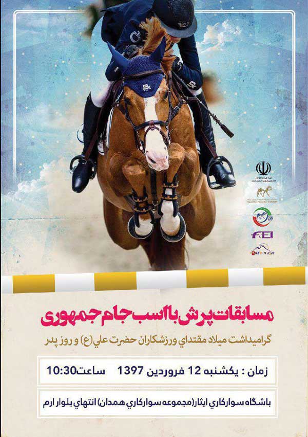 مسابقات پرش با اسب جام جمهوري (گراميداشت ولادت مقتداي ورزشكاران امام علي(ع)) ١٢فروردين روز جمهوري اسلامي باشگاه سواركاري ايثار -مجموعه سواركاري همدان ساعت ١٠:٣٠